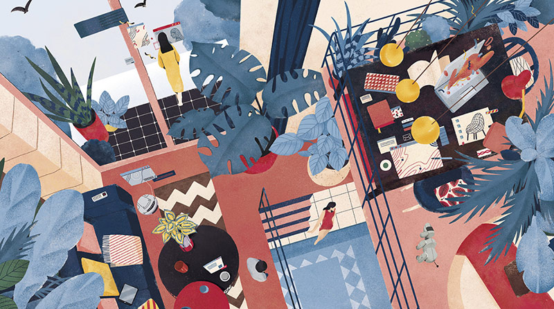 扁平插画(Flat illustrations)风格具有平面或抽象的特点,舍去复杂的结构、阴影和纹理等,用简单的外部轮廓来绘制出插画内部需要出现的物体的图形。